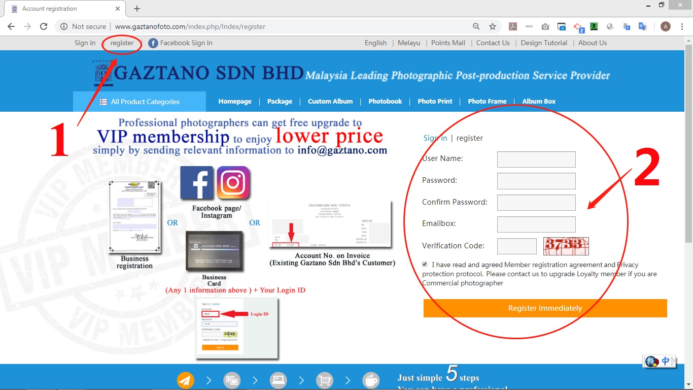 1) Visit http://www.gaztanofoto.com , click on the “Register” on the upper right corner of the page and fill in your registration information.