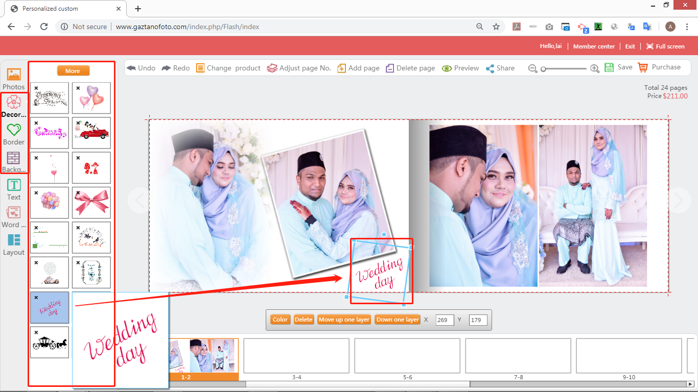 10)Click the tool area button on the left and drag the elements in the selected "Background, Decoration, Border" into the editing area to add various materials to design your work. (Clicks on the material and drags it into the editing area)