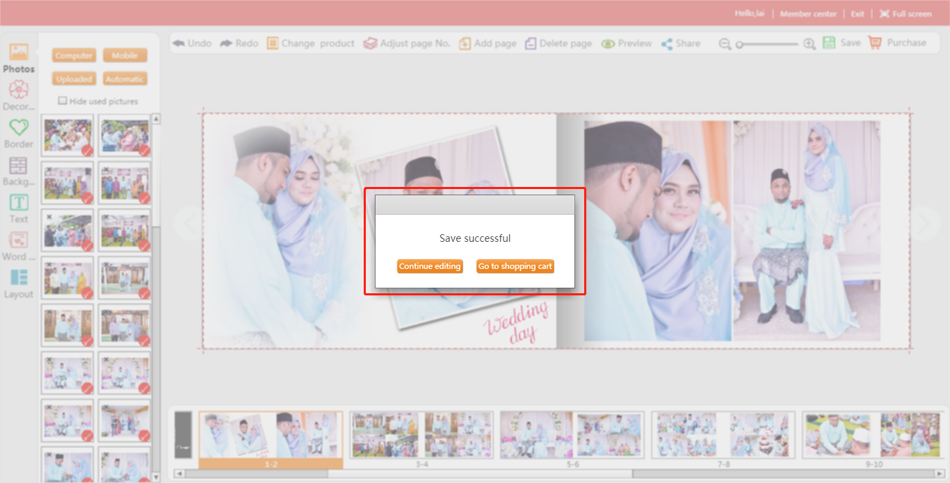 After designing the work, click the “Save” button in the lower right corner to save your works into your member center and add to the shopping cart to place an order.