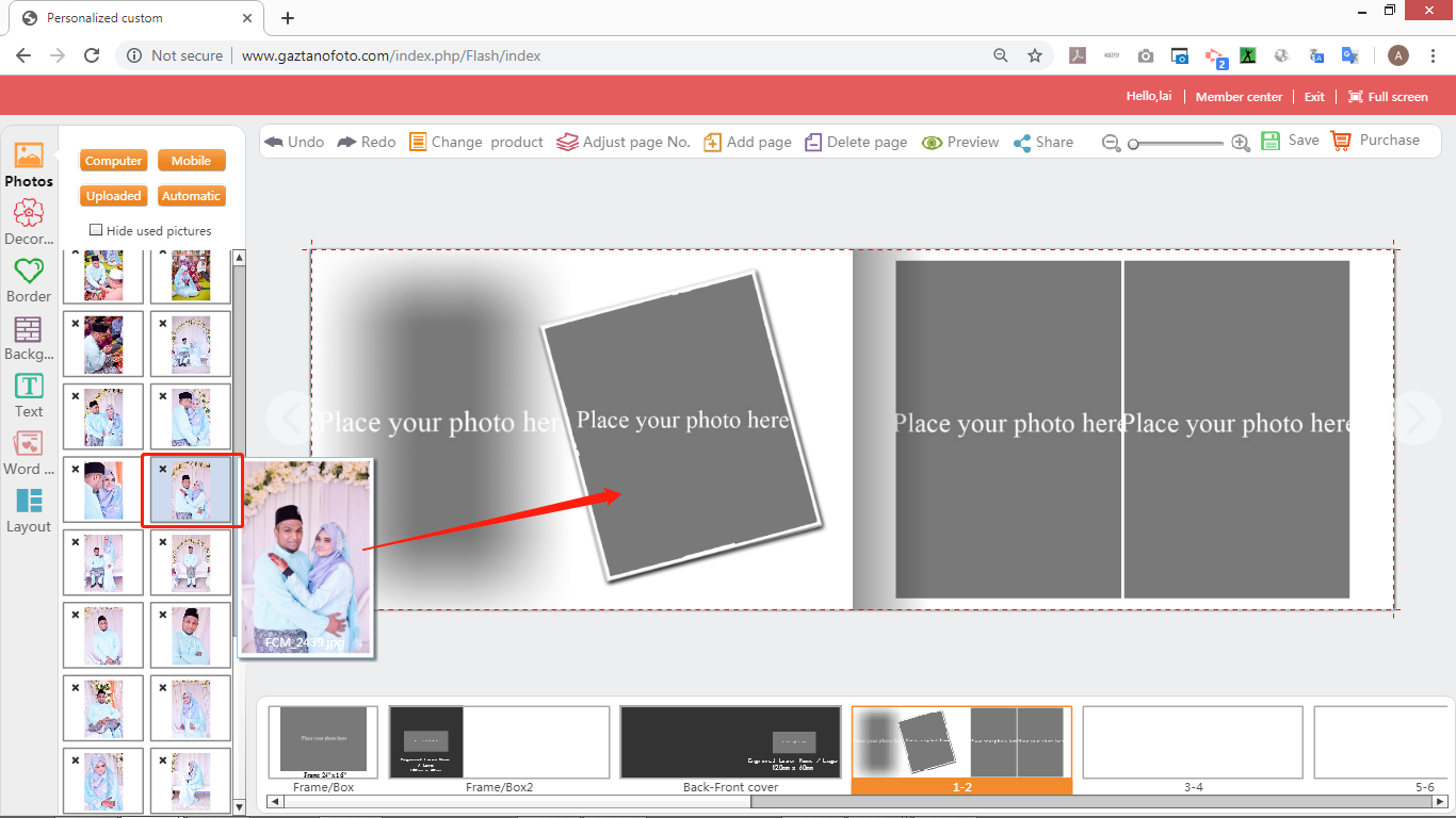 6) Drag the photo displayed on the left into the “Gray box of the picture area” on the right side, and clicks the picture to perform operations such as “size scaling, moving, rotating, cropping, etc.”