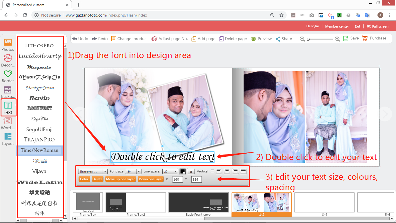 8) Click the "Text" button on the left and drag the selected font to the editing area. Double click to add any text content into the photo.