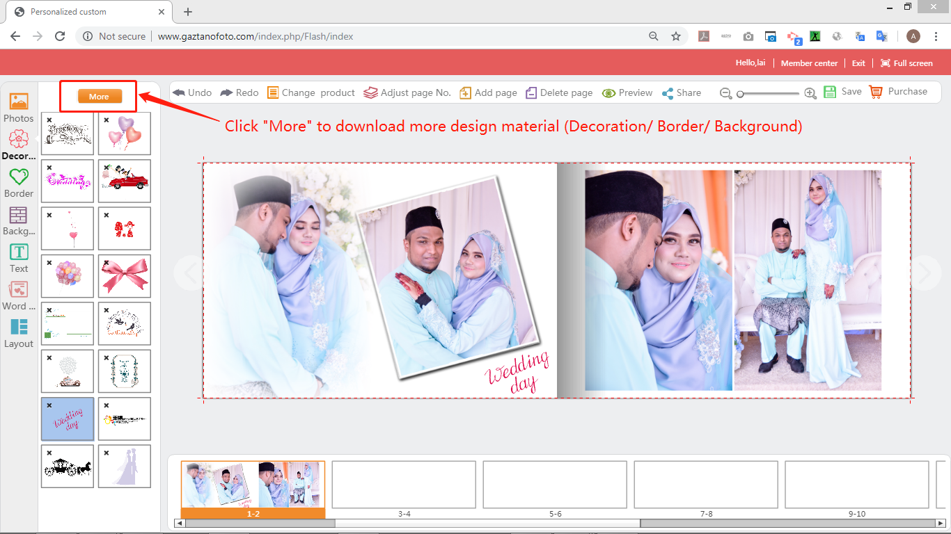 9) Click on the “More” button at the top to load more design material in the website (decoration clips, borders, backgrounds).